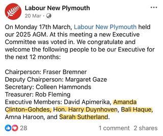 You will see from the attached photo, Amanda Clinton-Gohdes and Sarah Sutherland were both elected to the Executive Committee for the New Plymouth Labour Party in March this year. They don't advertise this widely in their Candidate material. Perhaps they should ?