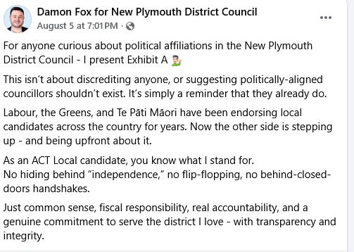 We think, like Damon Fox has done, all Candidates with political affiliations should have to make those affiliations publicly known when standing for Council.