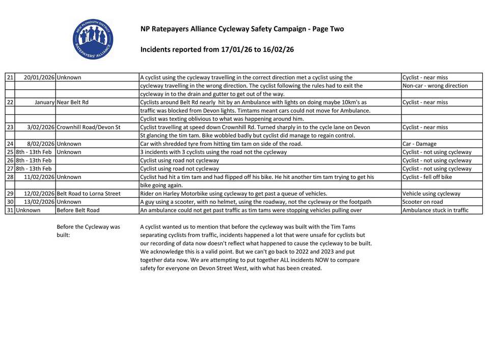 > Home > News > We have our Mid February Cycleway Incident report out today, with 20 new near misses or injuries since mid January 2026.