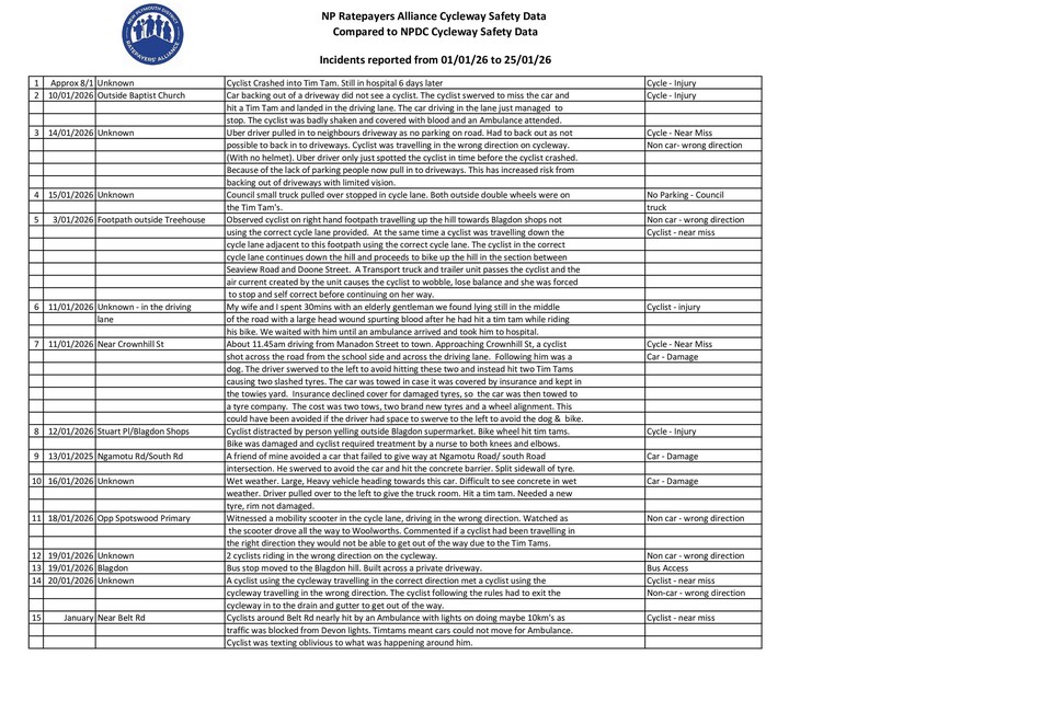 The lack of safety with the Devon Street West Cycleway, for all users, is not going to be fixed UNTIL all the incidents happening are encouraged to be reported to the NPDC, and they are actually written down.
