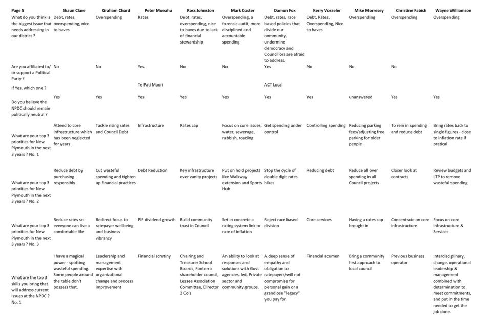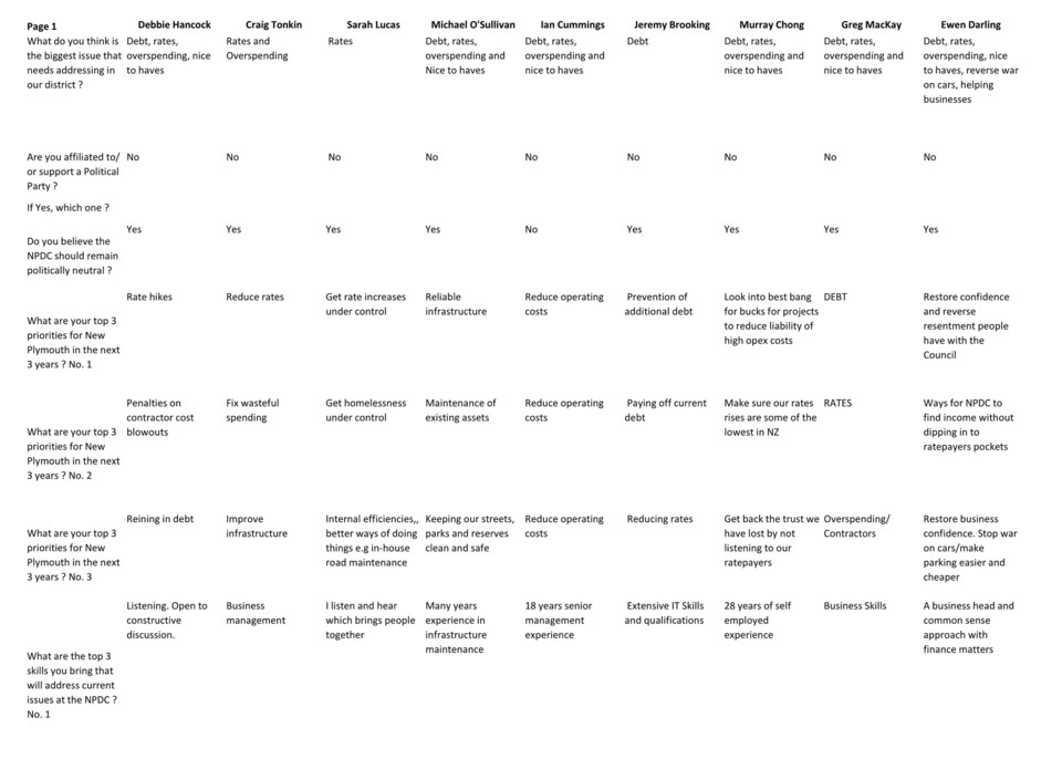 | What do you think is the biggest issue that needs addressing in our district ? | Debt, rates, overspending, nice to haves | Rates and Overspending | Rates | Debt, rates, overspending and Nice to haves | Debt, rates, overspending and nice to haves | Debt | Debt, rates, overspending and nice to haves | Debt, rates, overspending and nice to haves | Debt, rates, overspending, nice to haves, reverse war on cars, helping businesses | Debt, rates, overspending, nice to haves | Overspending | Rates | Debt, rates, overspending, nice to haves due to lack of financial stewardship | Overspending, a forensic audit, more disciplined and accountable spending | Debt, rates, race based policies that divide our community, undermine democracy and Councillors are afraid to address. | Debt, Rates, Overspending, Nice to haves | Overspending | Overspending | Overspending | Debt, rate increases, overspending, nice to have, operational inefficiencies | |