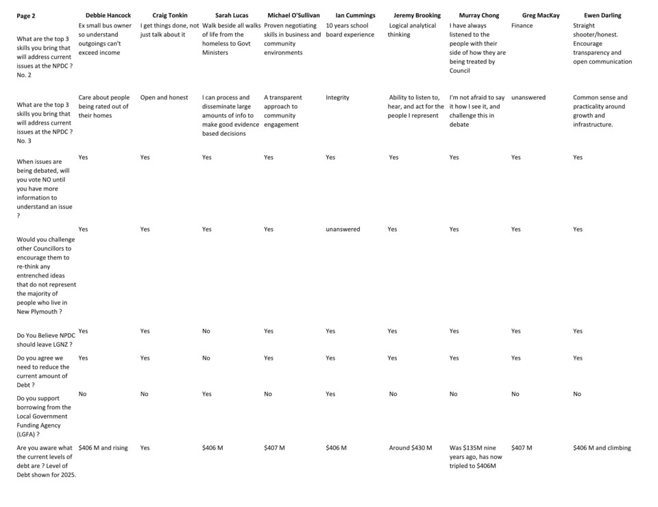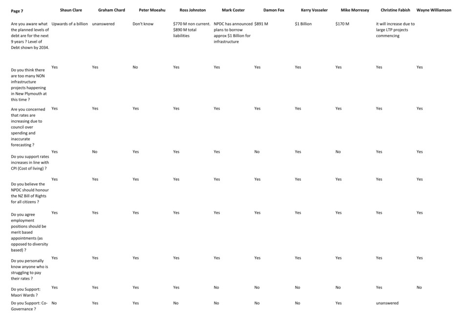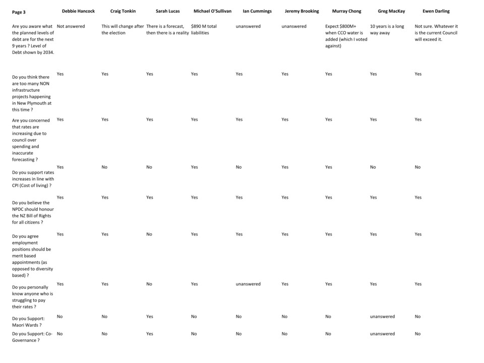 | Are you aware what the planned levels of debt are for the next 9 years ? Level of Debt shown by 2034. | Not answered | This will change after the election | There is a forecast, then there is a reality | $890 M total liabilities | unanswered | unanswered | Expect $800M+ when CCO water is added (which I voted against) | 10 years is a long way away | Not sure. Whatever it is the current Council will exceed it. | Upwards of a billion | unanswered | Don't know | $770 M non current. $890 M total liabilities | NPDC has announced plans to borrow approx $1 Billion for infrastructure | $891 M | $1 Billion | $170 M | it will increase due to large LTP projects commencing | Approx $800M | Forecast of $770M | |