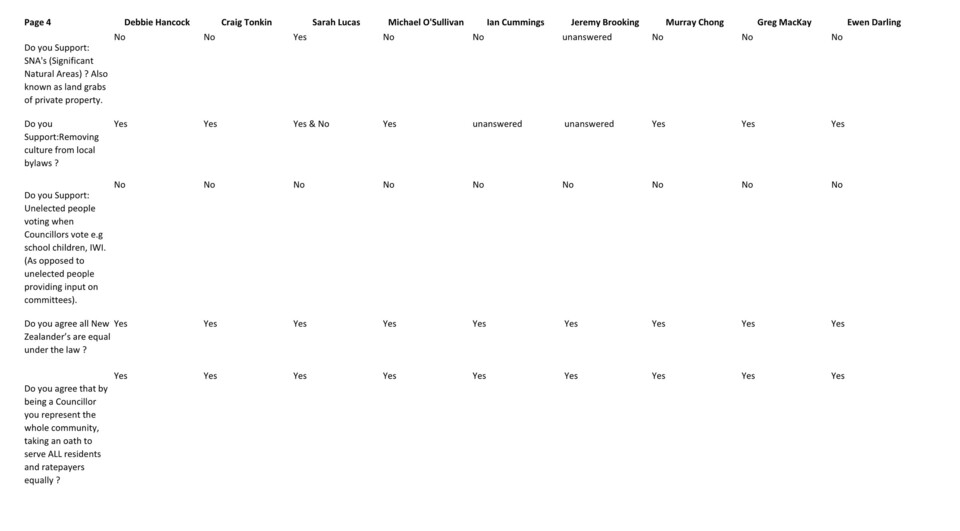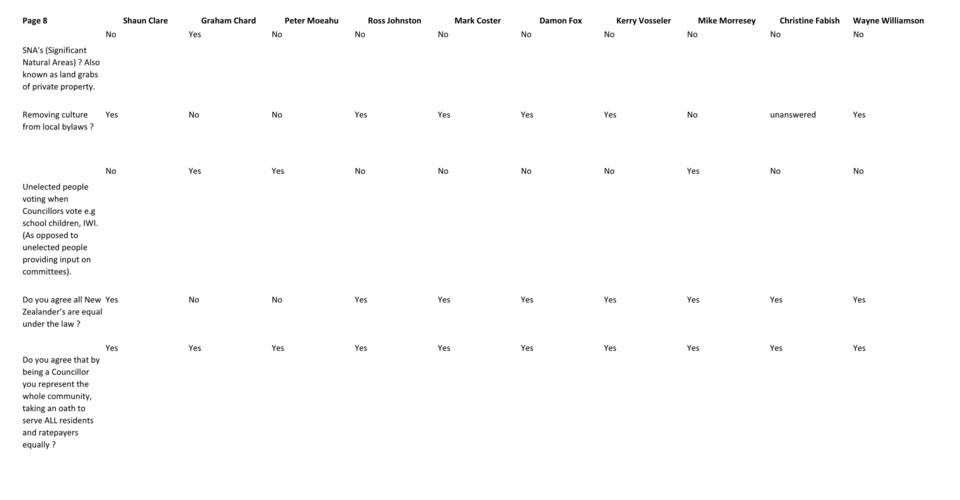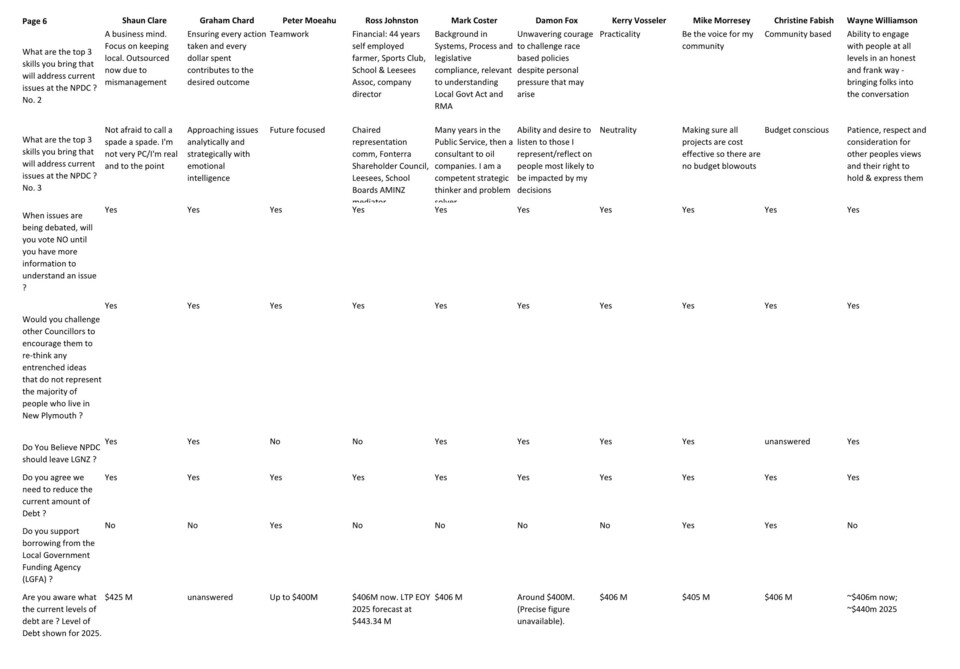 Care about people being rated out of their homes | Open and honest | I can process and disseminate large amounts of info to make good evidence based decisions | A transparent approach to community engagement | Integrity | Ability to listen to, hear, and act for the people I represent | I'm not afraid to say it how I see it, and challenge this in debate | unanswered | Common sense and practicality around growth and infrastructure. | Not afraid to call a spade a spade. I'm not very PC/I'm real and to the point | Approaching issues analytically and strategically with emotional intelligence | Future focused | Chaired representation comm, Fonterra Shareholder Council, Leesees, School Boards AMINZ mediator | Many years in the Public Service, then a consultant to oil companies. I am a competent strategic thinker and problem solver. | Ability and desire to listen to those I represent/reflect on people most likely to be impacted by my decisions | Neutrality | Making sure all projects are cost effective so there are no budget blowouts | Budget conscious | Patience, respect & consideration to others views and their rights to hold and express them | Critical Thinking - asking the questions not covered | |